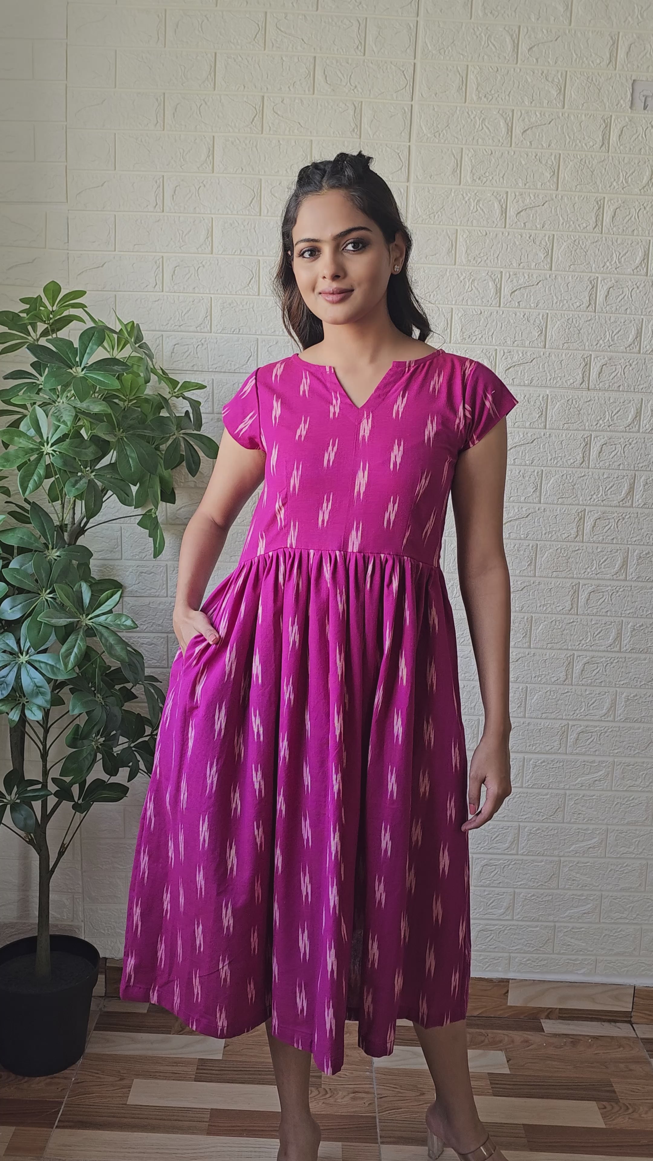 A beautiful magenta ikat dress with close V neck detail & pleated detailing at waist, flared hem with short sleeves and has 2 pockets. It summer friendly, very comfortable and stylish wear.