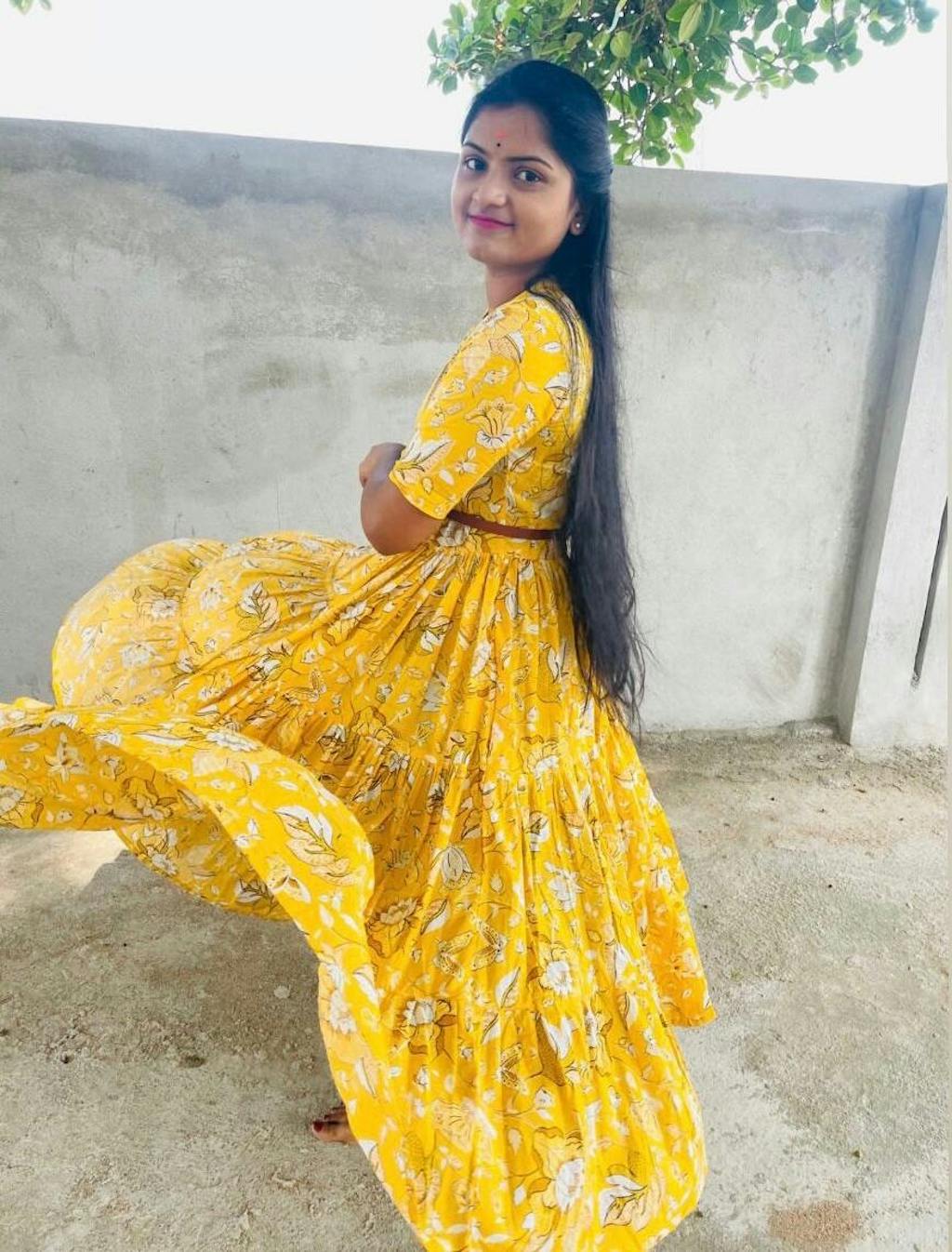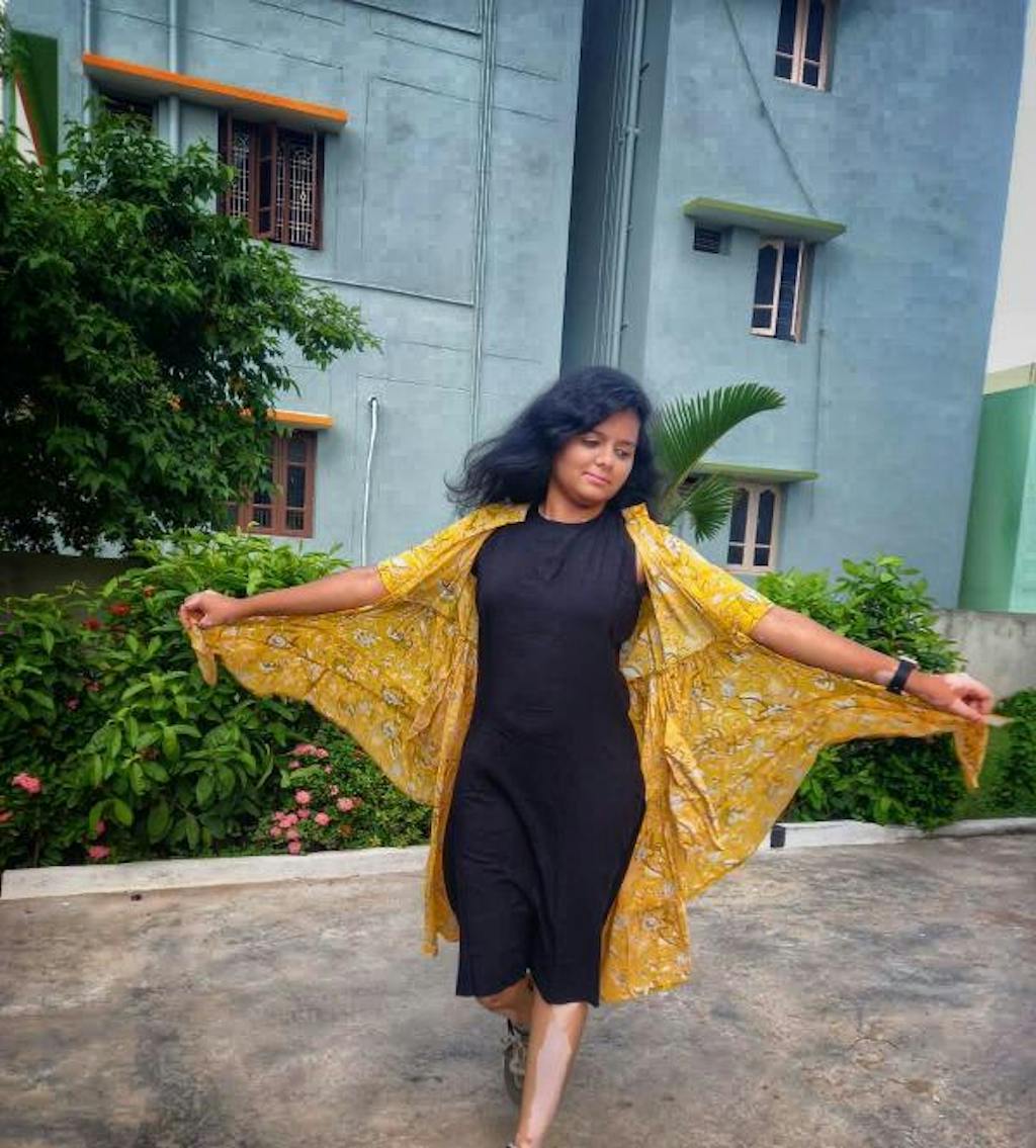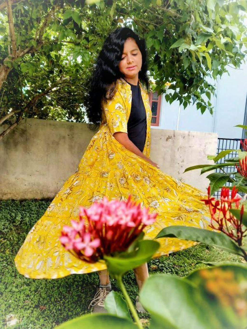 A black sleeveless dress with yellow print 3 tier shrug featuring square neck, elbow sleeves, has 2 pockets, flare shrug dress and givens you a trendy look.